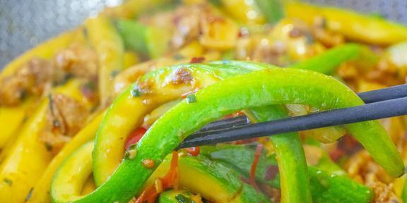 2. 角瓜炒肉:将切好的角瓜片和猪肉丝分别焯水,去除血水和腥味。热锅凉油,先炒肉丝至变色,再加入角瓜片,快速翻炒,加入适量的生抽、盐和鸡精,炒匀即可。